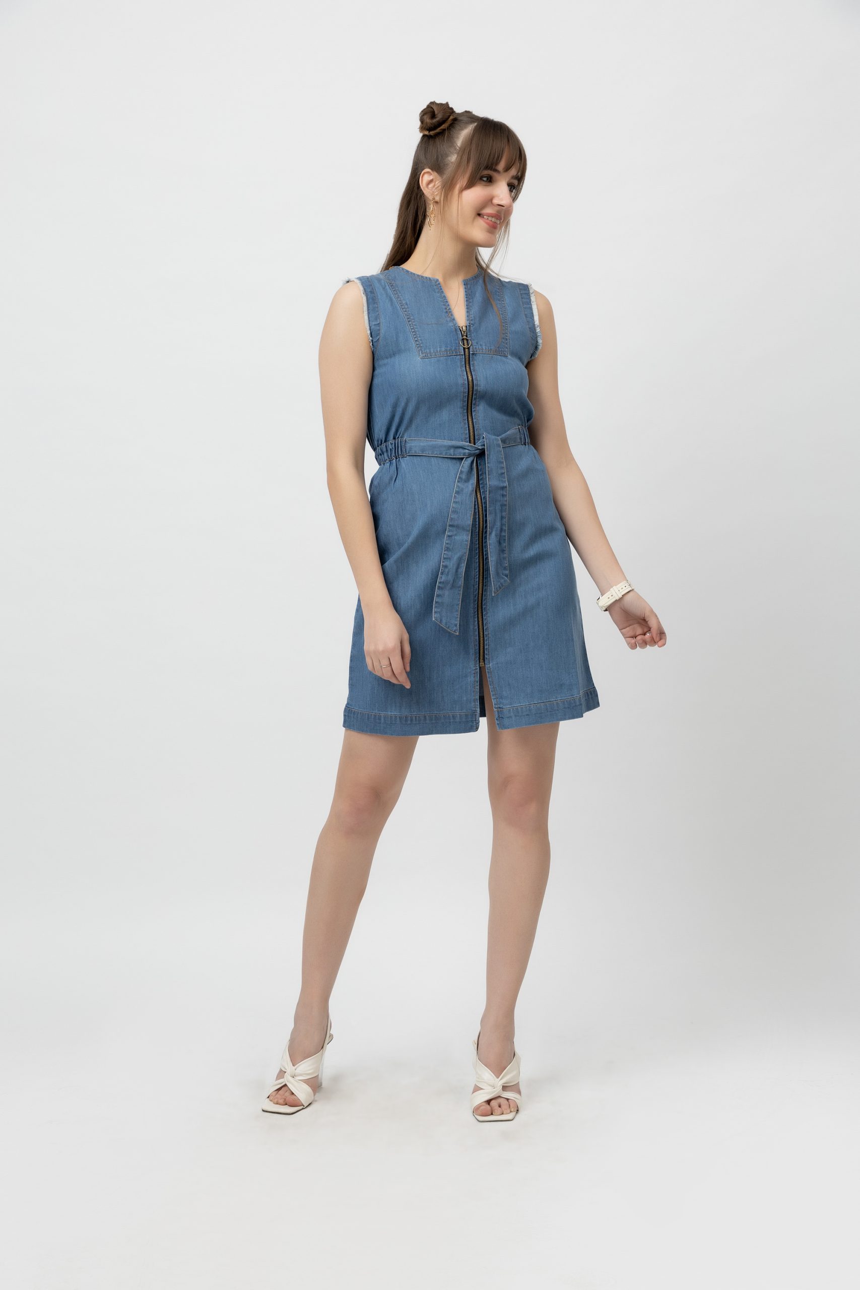 7onz Woman Stylish denim Sheath dress with front metal zip closure and raw hem detailing. Elasticated waist for a perfect fit and look.